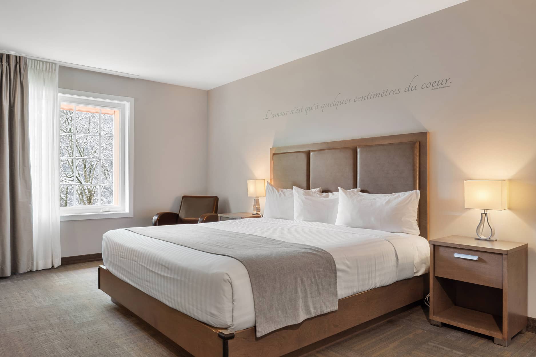 Sur place, le visiteur a l’embarras du choix au niveau des hébergements. Près de deux cents chambres et suites sont réparties dans deux établissements dotés de terrasses panoramiques. L’hôtel en possède le plus grand nombre. Les 113 unités offrent un grand confort à leurs résidents. L’hôtel abrite également un restaurant de deux cents couverts, un centre de soins (Zen Évasion) et un centre de détente au concept unique au Québec : le Spa O’Quartz, aménagé à même la falaise de Pointe-au-Pic, avec sa fabuleuse chute d’eau naturelle de plus 6 mètres et ses saunas secs. Tout pour se ressourcer avec vue !