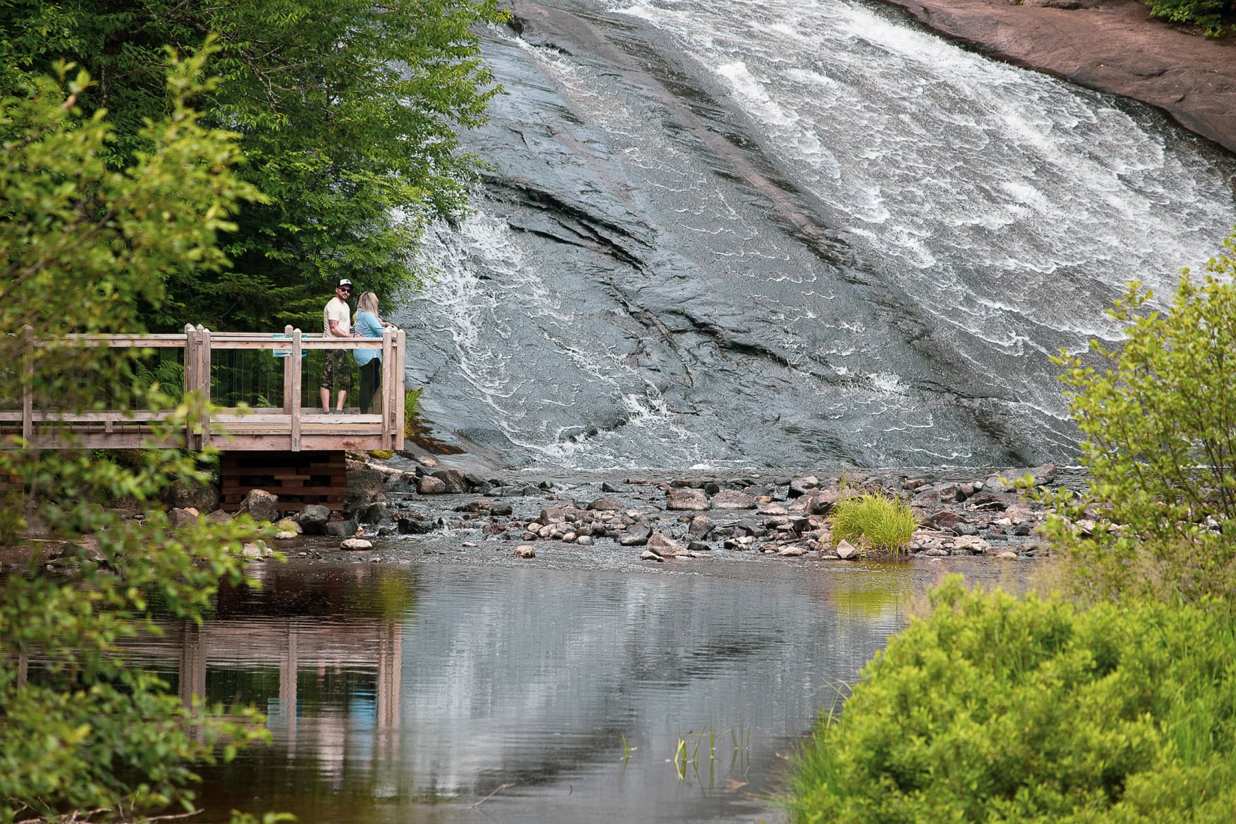 Depuis sa création en 2012 au nord de Ferme-Neuve, le Parc régional Montagne du Diable protège et met en valeur 1 770 hectares de paysages montagneux et forestiers. Riche d’une précieuse biodiversité, ce territoire se présente comme un concentré des Hautes-Laurentides. Il comprend quatre sommets, dont une montagne auréolée de légendes, la montagne du Diable, qui culmine à 783 mètres d’altitude. On y trouve aussi le lac et la célèbre chute Windigo, large de plus de 18 mètres et haute de 55 mètres : un spectacle en soi ! Ouvert au public en toute saison, le parc régional Montagne du Diable compte trois grands secteurs offrant des expériences distinctes. Le secteur Village des Bâtisseurs, bordé par le lac de la Montagne, marque l’entrée principale du Parc ; il abrite le pavillon d’accueil Léopold-Papineau et donne accès à l’ensemble des sentiers. Avec ses points de vue à couper le souffle, le secteur Montagne est le terrain de jeux rêvé des randonneurs de tous niveaux ; il invite à prendre de la hauteur été comme hiver pour décrocher vraiment du quotidien et compte plusieurs refuges et abris en montagnes. Quant au secteur Lac et Chute Windigo, où se trouve le pavillon d’accueil Desjardins, il est le rendez-vous des amateurs d’activités nautiques et de farniente sur la rive sablonneuse du lac, à deux pas des sites de camping et des hébergements de prêt-à-camper disposés au cœur de la forêt.